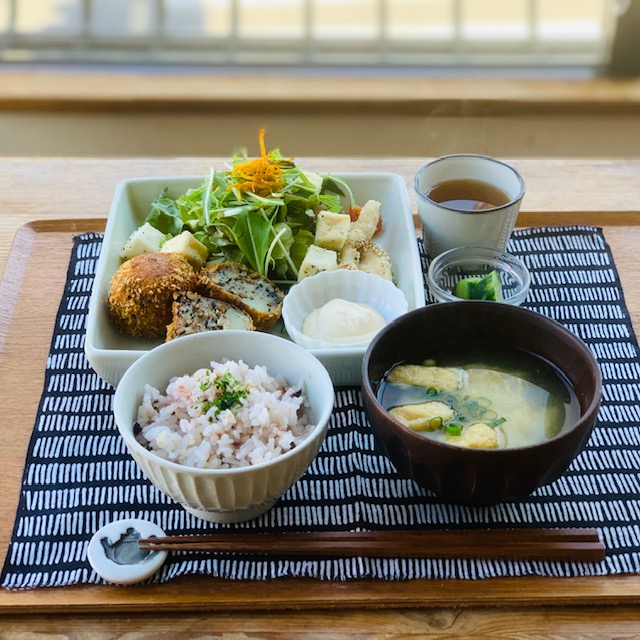 ごはんは、白米に無農薬栽培の緑米・黒米を加えふっくらもちもちに炊き上げたからだにやさしい定食です。